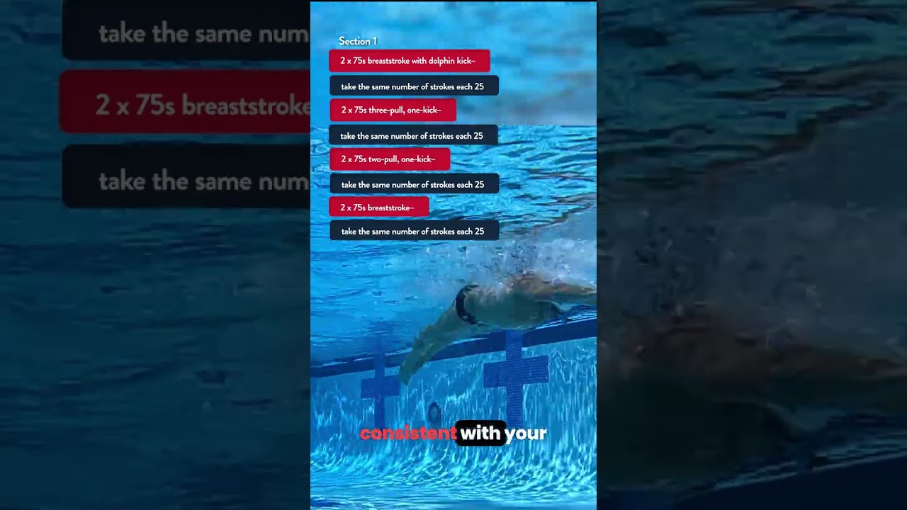 - 2 x 75s breaststroke with dolphin kick—take the same number of strokes each 25