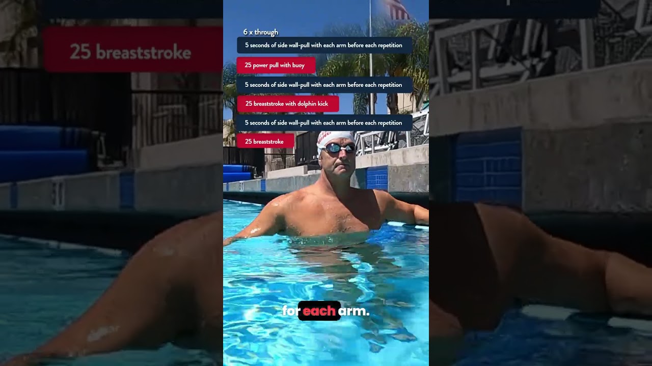 - 25 breaststroke with dolphin kick—5 seconds of side wall-pull with each arm before each repetition