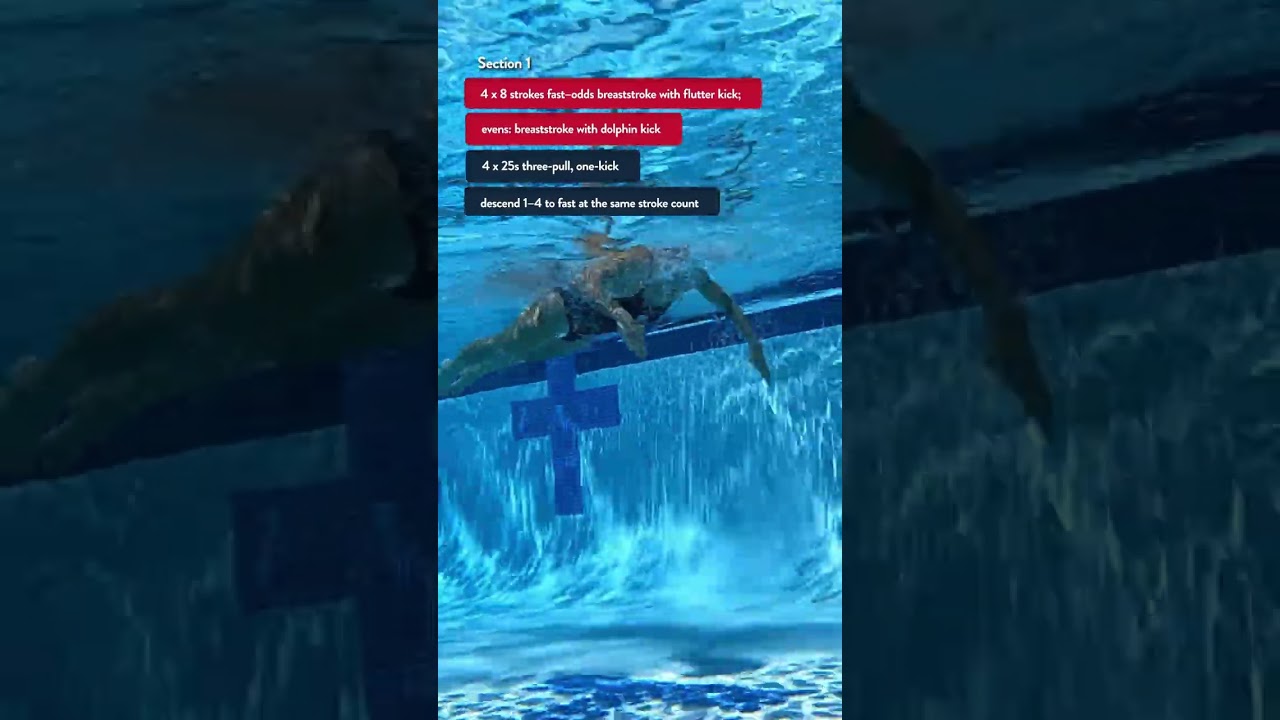 - 4 x 8 strokes fast. Odds breaststroke with flutter kick; evens breaststroke with dolphin kick