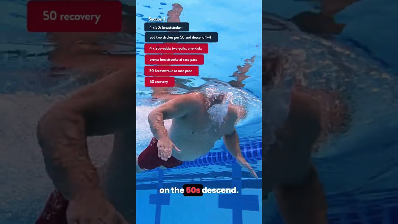 - 4 x 50s breaststroke—add two strokes per 50 and descend 1–4